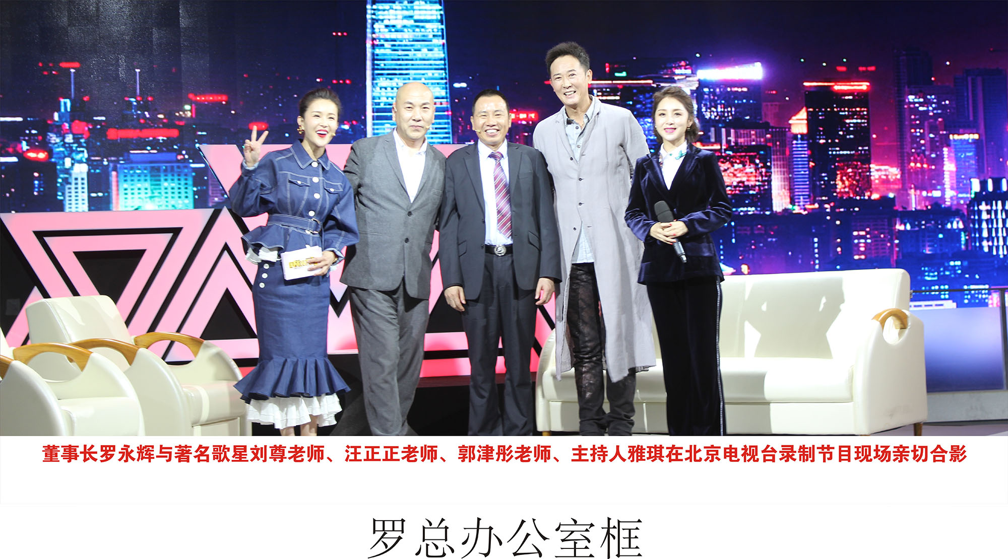 新望董事長(zhǎng)羅永輝與著名歌星劉尊老師、汪正正老師、郭津彤老師、主持人雅琪在北京電視臺(tái)錄制節(jié)目現(xiàn)場(chǎng)親切合影